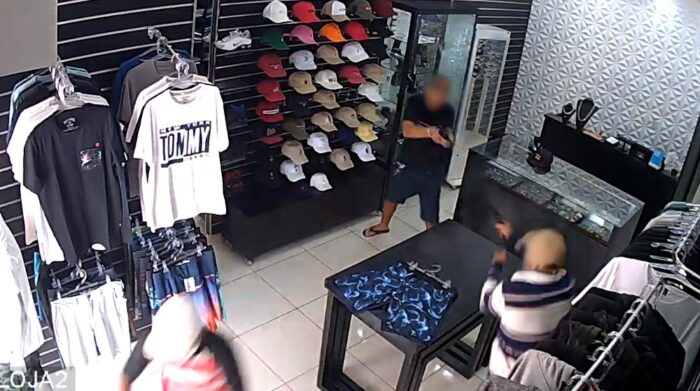 Nas imagens, é possível ver que os três homens fingem escolher produtos na loja, até o momento em que um deles saca uma arma e anuncia o assalto. Após uma breve discussão, o dono da loja saca uma arma que tinha por baixo da blusa e atira nos três ladrões.