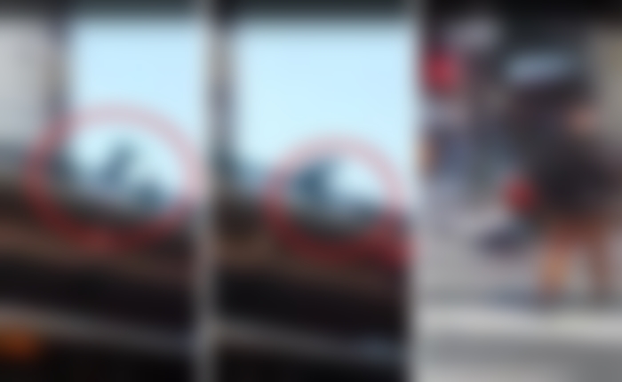 O homem que aparenta ter idade entre 30 e 40 anos aparece em pé pelo lado de fora da mureta da ponte, segundos depois, toma impulso e se arremessa contra o chão, o barulho é bem alto.