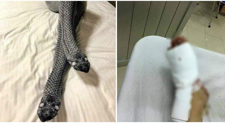 Uma mulher que tentou surpreender o marido usando uma meia-calça com estampa de pele de cobra, teve as pernas quebradas com um cassetete após o esposo confundir o tecido da meia com uma víbora verdadeira.