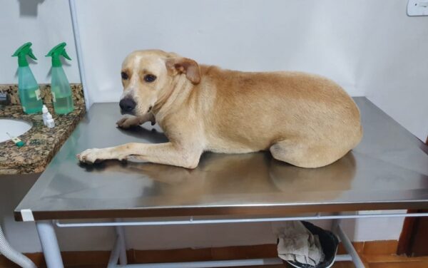 A cadela foi levada ao veterinário para realizar exames que comprovem as lesões.