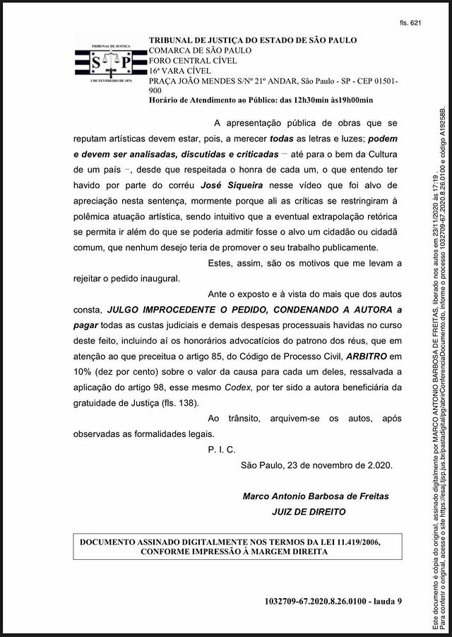 O Juiz de direito, Marco Antônio Barbosa de Freitas aceitou o pedido da defesa do apresentador e arquivou o processo, e condenou a modelo trans a pagar todas as custas judiciais dos advogados.