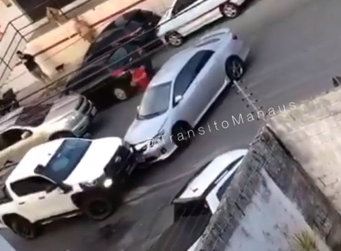 “Não faça isso, meu amigo. Eu vou tirar o carro, meu amigo”, pedia o motorista do Toyota Corolla.