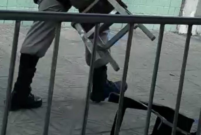 Imagens gravadas na manhã desta terça-feira (12), mostram o momento em que policiais militares chegam no local e quebram bancos e cadeiras usadas na reserva dos lugares.