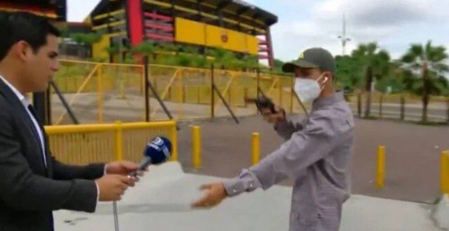 Um repórter de uma TV do Equador foi abordado por um homem armado quando fazia um “ao vivo” na frente do estádio Monumental Isidro Romero Carbo, a casa do tradicional Barcelona de Guayaquil. O assalto ocorreu na última sexta-feira (12/2).