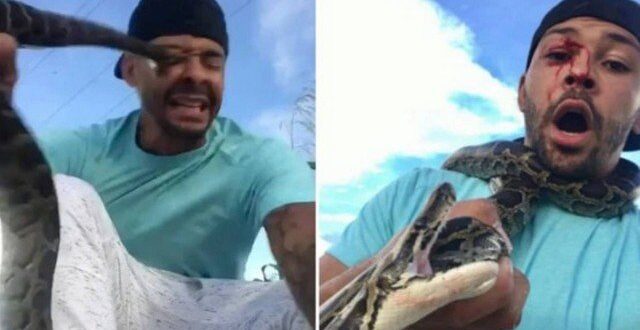 No incidente, o manipulador, radicado em Los Angeles (Califórnia), é visto segurando a cobra enquanto a píton birmanesa – que é nativa do sudeste da Ásia – afunda suas presas em um dos braços dele várias vezes para se defender. Nick diz, mantendo a calma:
