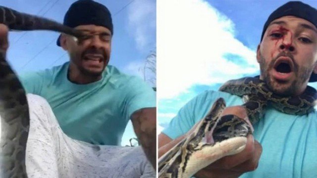 No incidente, o manipulador, radicado em Los Angeles (Califórnia), é visto segurando a cobra enquanto a píton birmanesa – que é nativa do sudeste da Ásia – afunda suas presas em um dos braços dele várias vezes para se defender. Nick diz, mantendo a calma: