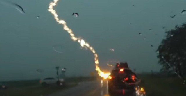 Uma câmera de segurança em um veículo flagrou o momento em que outro carro foi atingido por um raio durante tempestade em estrada na altura de Waverly (Kansas, EUA). No momento do acidente, ocorrido em 25 de junho, cinco pessoas estavam a bordo do SUV, incluindo três crianças, de 3 anos, 1 ano e meio e 8 meses.