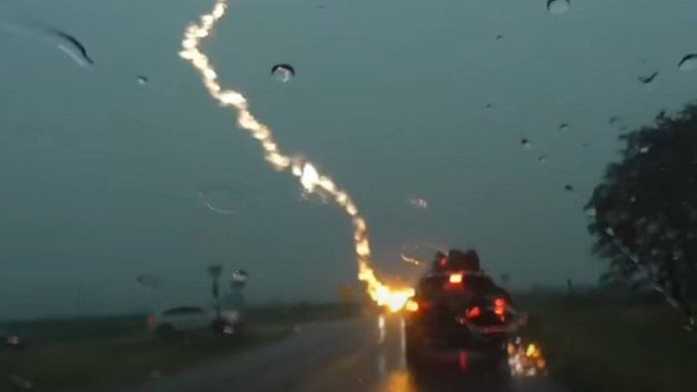 Uma câmera de segurança em um veículo flagrou o momento em que outro carro foi atingido por um raio durante tempestade em estrada na altura de Waverly (Kansas, EUA). No momento do acidente, ocorrido em 25 de junho, cinco pessoas estavam a bordo do SUV, incluindo três crianças, de 3 anos, 1 ano e meio e 8 meses.