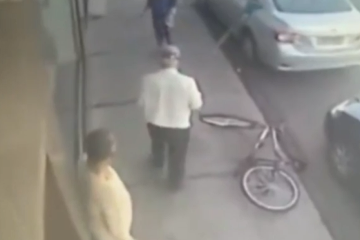 Câmeras de segurança registraram o momento em que o jovem aproveita que o idoso vira de costas para dar uma voadora no aposentado, que é arremessado ao chão.