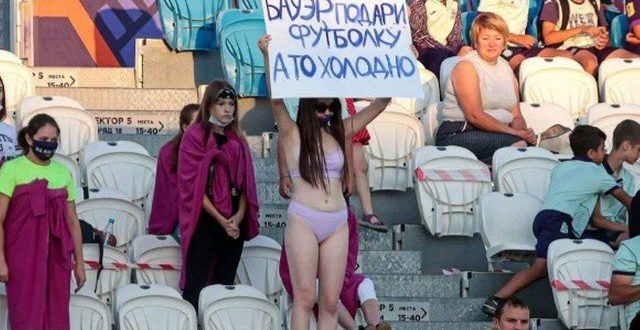 Uma torcedora ficou só de calcinha e sutiã (e máscara) na arquibancada da BetBoom Arena para pedir a camisa de Moritz Bauer em partida realizada no último dia 6 entre Ufa e Lokomotov Moscow, em partida pelo Campeonato da Rússia de futebol.