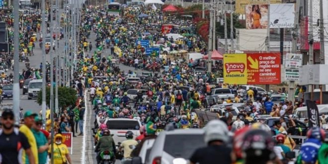 Pelas ruas da cidade, muitos apoiadores a pé esperam a passagem da motociata.