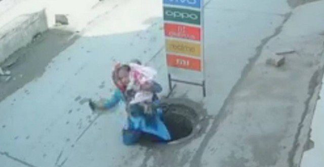 Uma câmera de segurança flagrou o momento em que uma mulher caiu em um bueiro aberto em rua de comunidade pobre em Faridabab (Índia), quando caminhava com a filha, de 1 ano, no colo.