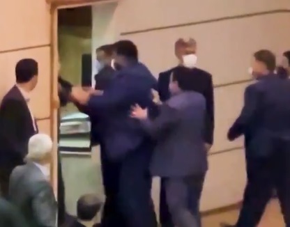 Um homem subiu ao palco e deu um tapa no recém-nomeado governador da província iraniana do Azarbaijão Oriental, Abedin Khorram, durante sua cerimônia de nomeação no sábado (23).