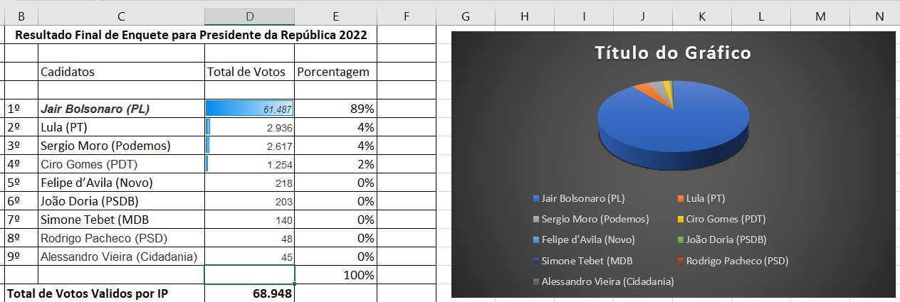 Foi realizada uma única perguntas para esta enquete. “Em quem você votaria para Presidente 2022??“, com opções de resposta para escolha entre 09 candidatos, com os principais nomes vinculados a mídia nacional.