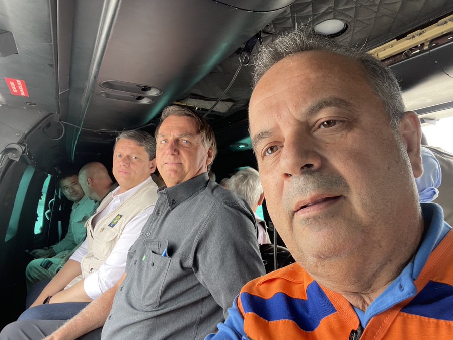 O presidente Jair Bolsonaro, acompanhado dos ministros Rogério Marinho (Desenvolvimento), João Roma Neto (Cidadania), general Augusto Heleno (GSI), Luiz Eduardo Ramo (Casa Civil) e Tarcísio Freitas (Infraestrutura) sobrevoam nesta terça-feira (1º) áreas atingidas pelas chuvas em São Paulo.