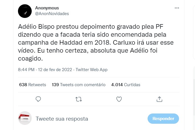 Conforme a página da Esquerda, Adélio afirmou que foi contratado pela campanha de Haddad no PT.