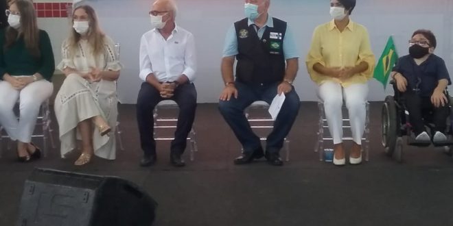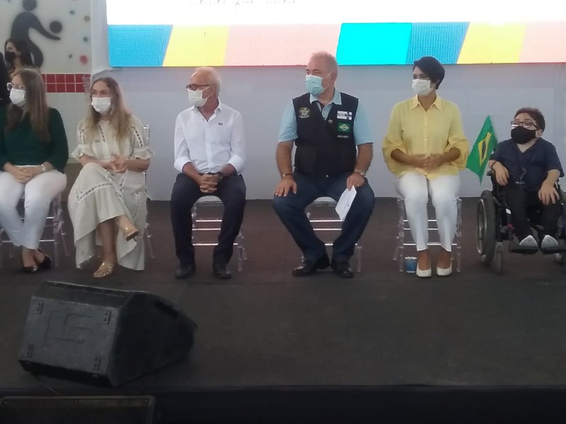 Ela conduziu o deputado federal Patrick, ativista das doenças raras, até o palco. Um grupo de dança formado por pessoas com necessidades especiais atendidas pela APAE se apresentou na solenidade.