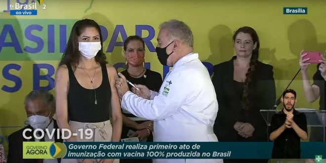 O ato simbólico foi realizado durante uma cerimônia do Ministério da Saúde em Brasília na tarde de hoje, mais de 4 meses depois da previsão de entrega das primeiras doses da vacina.