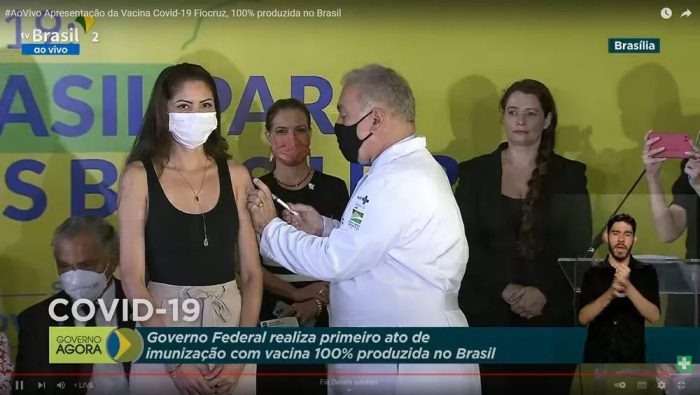 O ato simbólico foi realizado durante uma cerimônia do Ministério da Saúde em Brasília na tarde de hoje, mais de 4 meses depois da previsão de entrega das primeiras doses da vacina.