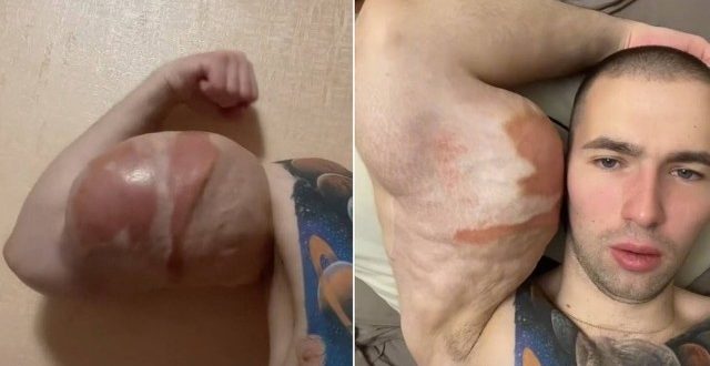 O jovem de 25 anos foi forçado a ter seus tríceps turbinado cirurgicamente removido, mas braços salientes, que parecem perigosamente fora de lugar no seu corpo esbelto, voltaram a despertar a atenção de internautas nas redes sociais.
