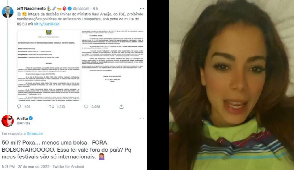 Neste domingo (27), a cantora Anitta menosprezou a decisão do ministro Raul Araújo, do Tribunal Superior Eleitoral (TSE), que proibiu que artistas e músicos que se apresentam no Festival Lollapalooza façam propaganda eleitoral em favor de pré-candidatos às eleições de outubro.
