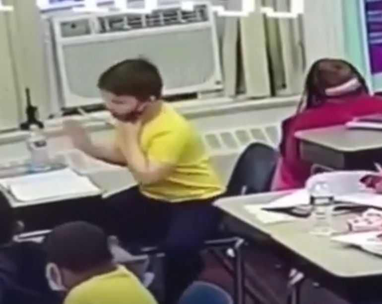 A câmera de segurança do colégio East Orange Community Charter flagrou o momento em que o aluno tentou abrir a garrafa com a boca e acabou engolindo a tampa.