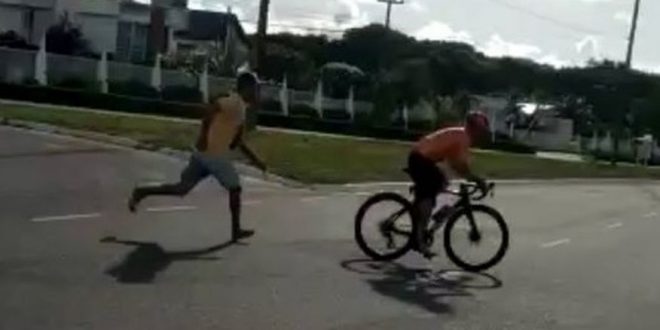 Um ciclista foi perseguido e empurrado por um homem em frente a um condomínio no bairro do Cabo Branco, em João Pessoa, na manhã deste sábado (14).