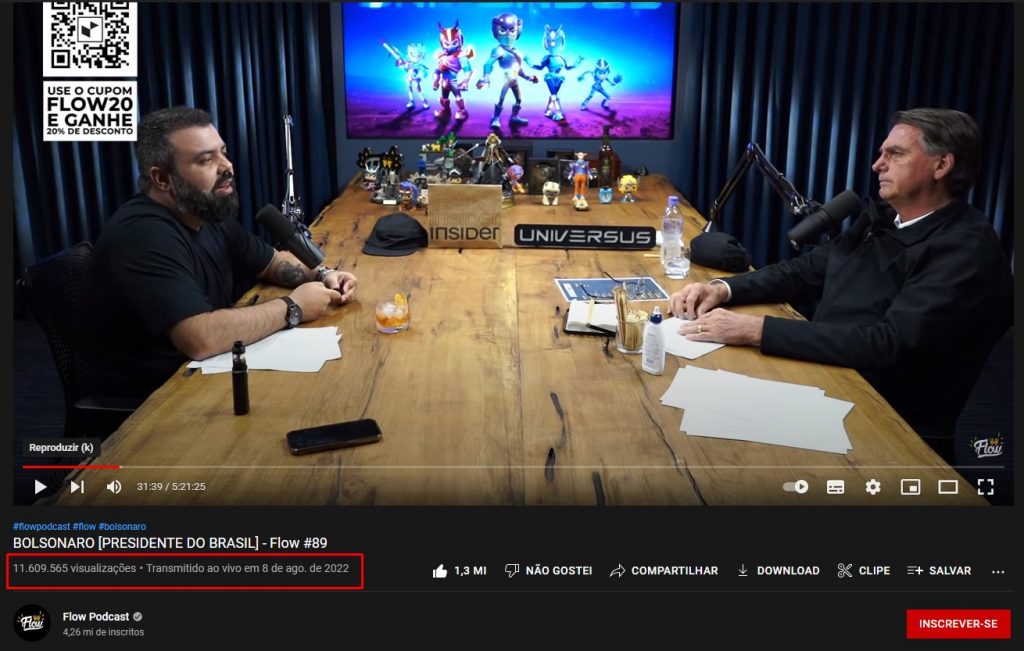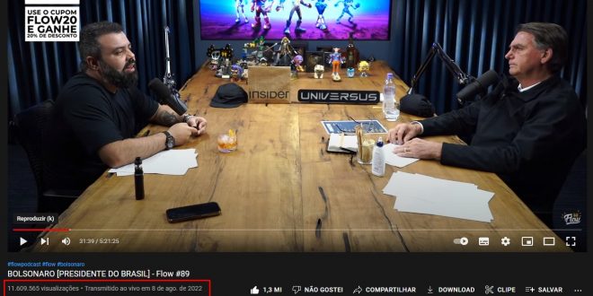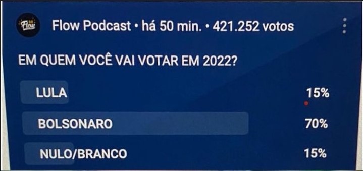 Durante entrevista do Presidente Jair Bolsonaro ao FlowPodcast no YouTube, foi aberto uma enquete ao vivo, onde mais de 400 mil pessoas poderão opinar.