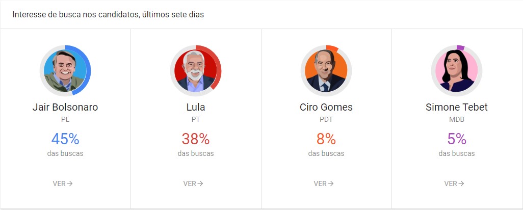 As buscas por Ciro Gomes (PDT) correspondem a apenas 8%; Simone Tebet (MDB) soma 5%; 1% ficou nas mãos de Felipe D’Avila (Novo).