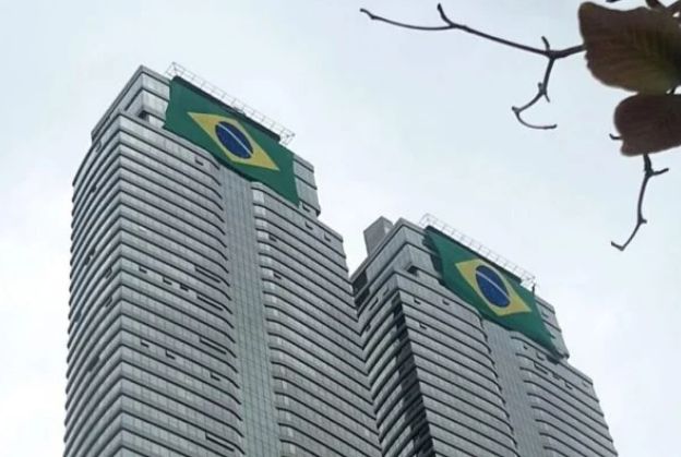 Imóvel conhecido como “prédio do Neymar”, em Camboriú (SC), exibe duas bandeiras gigantes do Brasil