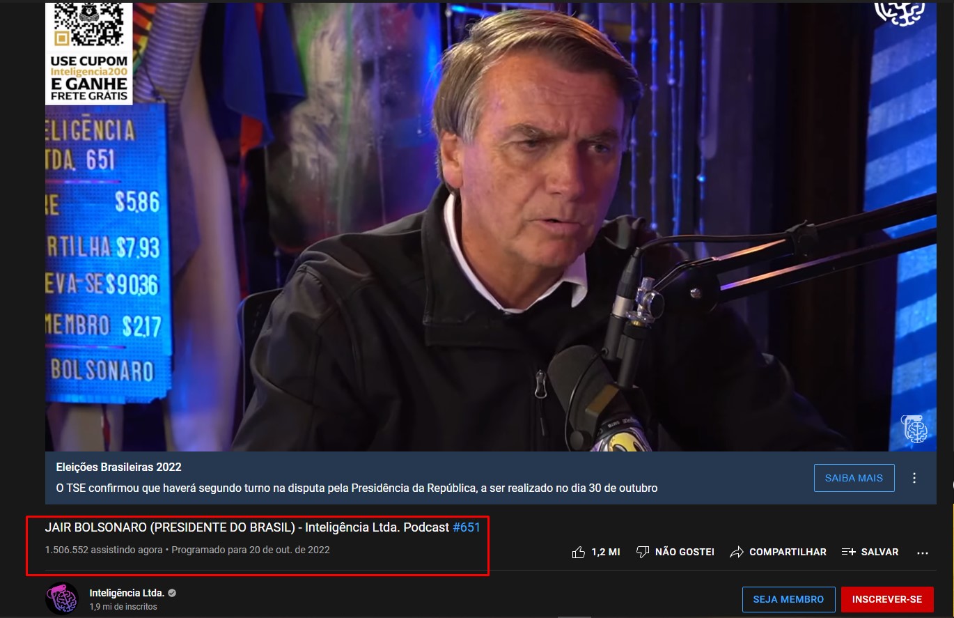 Dois dias depois, o presidente Jair Bolsonaro (PL) bateu hoje o recorde de audiência simultânea alcançada pelo ex-presidente Luiz Inácio Lula da Silva (PT) em um podcast, no YouTube.
