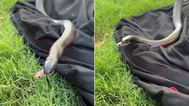 Ao chegar ao local, na tarde da última segunda-feira (6/2), um membro da equipe notou que uma cobra-marrom-oriental estava tentando sair pela boca de uma cobra-preta-de-barriga-vermelha, que era o objeto inicial do seu interesse.