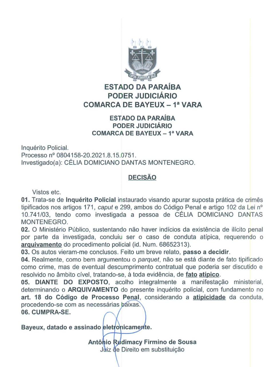 Atendendo pedido do Ministério Publico, o juiz da 1ª Vara da Comarca de Bayeux, arquivou o inquérito policial instaurado contra a Presidente da ONG Aliança Bayeux Franco Brasileira e ex-vereadora Célia Domiciano.
