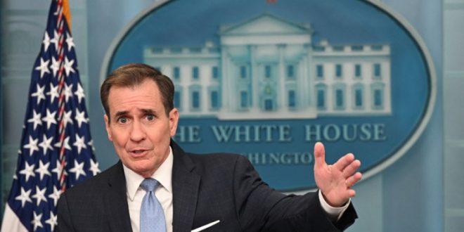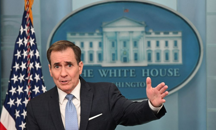 O coordenador do Conselho de Segurança Nacional para Comunicações Estratégicas, John Kirby, fala durante a coletiva de imprensa diária na Sala Brady da Casa Branca em Washington