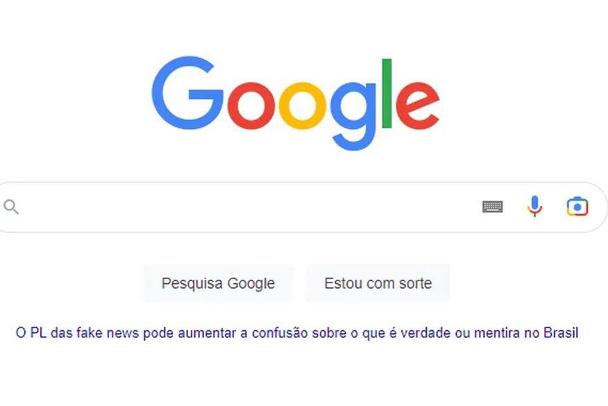 Ao longo dos últimos dias, e até o início da tarde desta terça, a página inicial do buscador exibia a mensagem: “O PL das fake news pode aumentar a confusão sobre o que é verdade ou mentira no Brasil”.