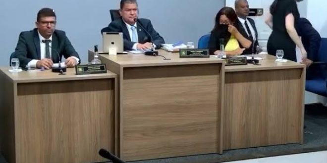 A vereadora Ciety Cerqueira, secretária da mesa, usa sua blusa para cobrir o nariz e em seguida o presidente decide suspender a sessão. “Eu suspendo a sessão nesse momento porque tá (sic) dificil aqui). Porquê soltaram… É o gás?”, finaliza e uma tela azul aparece.
