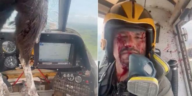 Ao decolar em uma aeronave de fumigação em Vinces, na província de Los Ríos, no Equador, um piloto ficou coberto de sangue após uma ave atingir a cabine e ficar presa em parte da fuselagem.
