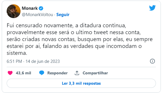 Fui censurado novamente, a ditadura continua, provavelmente esse será o ultimo tweet nessa conta, serão criadas novas contas, busquem por elas, eu sempre estarei por ai, falando as verdades que incomodam o sistema.— Monark (@MonarkVoltou) June 14, 2023