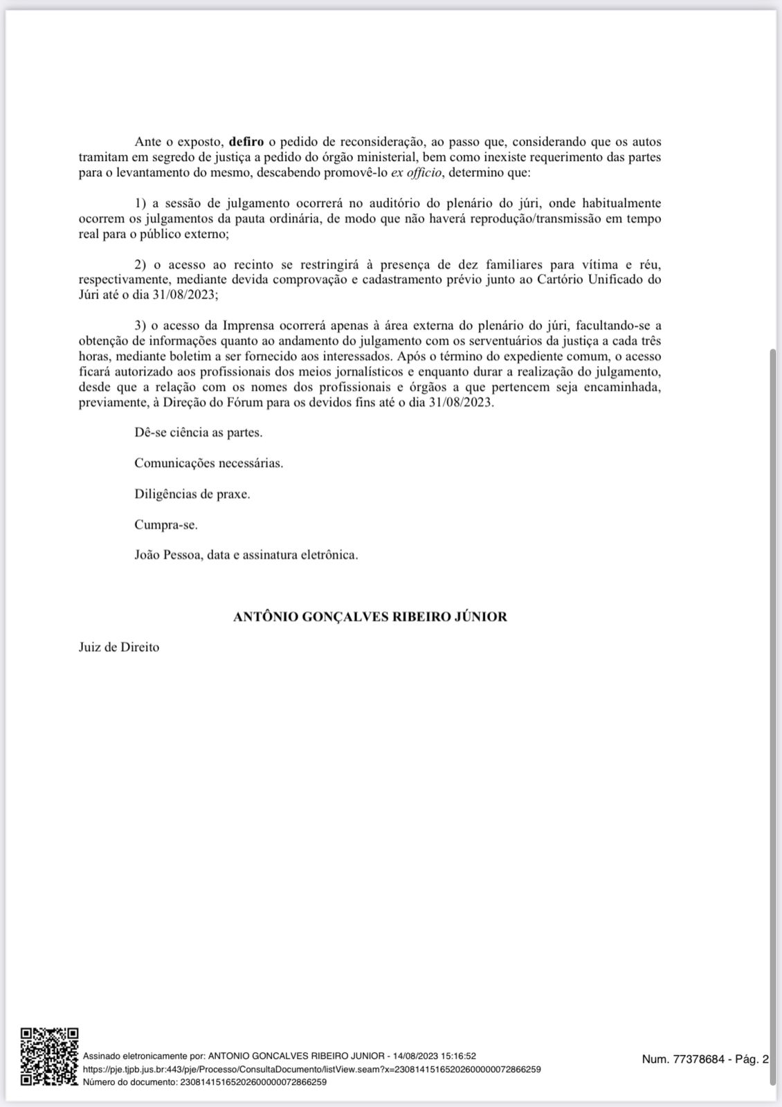 O juiz havia determinado que qualquer pessoa poderia assistir ao julgamento, inclusive, determinou a instalação de um telão no Fórum, entretanto, afirmou que a “defesa apresenta argumentos capazes de justificar a modificação” e restringiu o julgamento aos parentes de vítima e acusado.
