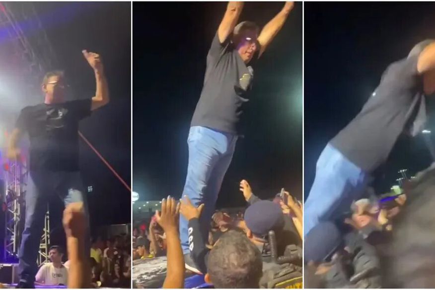 Era pra cair nos braços do povo, mas Antônio Maurício Pinheiro, o prefeito de Senador Pompeu, acabou caindo no chão. Ele comemorava, em meio a uma festa no centro da cidade na noite de domingo (3), o aniversário de 127 de emancipação política do município, quando se empolgou e se jogou na plateia.
