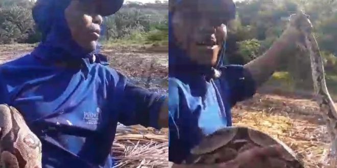 O conteúdo mostra a captura de uma cobra, possivelmente uma jiboia, em uma das áreas de plantio de cana de açúcar.
