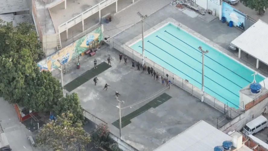 Os exercícios de guerra acontecem em uma área que poderia servir de lazer para a comunidade, em uma quadra de futebol com piscina, ao lado de uma creche e de cinco escolas municipais, mas são de uso exclusivo dos criminosos.