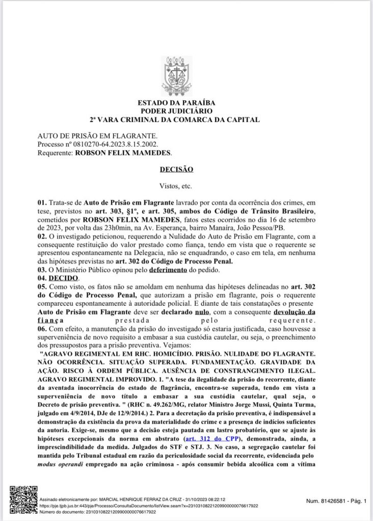 Nesta terça (31), o juiz da 2ª Vara Criminal de João Pessoa anulou o auto de prisão em flagrante do perito Robson Félix acusado de matar atropelado o motoboy Orlando Pereira no dia 17 de setembro, que conduzia a sua moto pela avenida Esperança, em Manaíra, e foi atingido pelo carro do perito que transitava em alta velocidade pela contramão.
