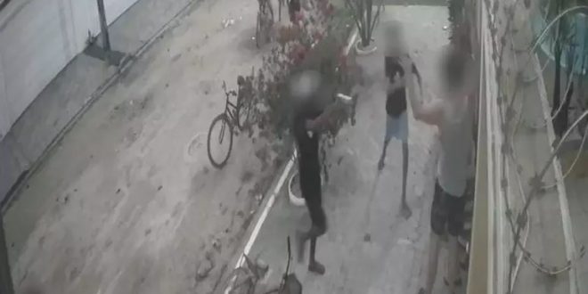 Um vídeo gravado por uma câmera de segurança mostra que, ao perceber que se tratava de um assalto, o homem levantou os braços e entregou o celular aos bandidos. Em seguida, os criminosos foram para cima dele, que cobriu a cabeça, mas levou tapas, cotoveladas e outras agressões.