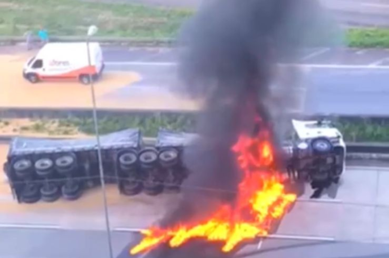 O Corpo de Bombeiros também foi acionado para o local do acidente para realizar o controle das chamas. Em registros feitos por pessoas que estavam próximo a BR-101, é possível ver o fogo se espalhando na carreta.