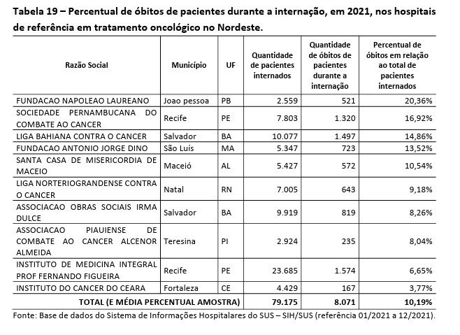 O percentual de óbitos com relação a pacientes internados no Laureano foi de 20,36%. O número é o mais alto entre dez hospitais e institutos de tratamento do câncer no Nordeste.