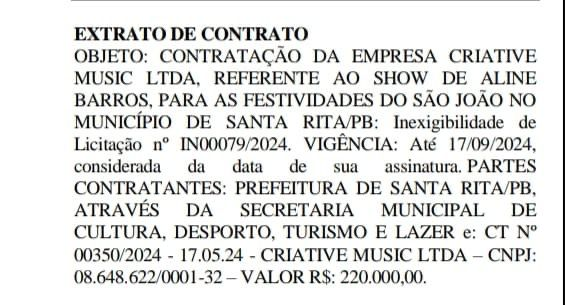 Prefeitura de Santa Rita assinou contrato para o show com a empresa Criative Music LTDA. A contratação ocorreu por inexigibilidade de licitação.
