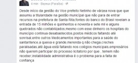 Apresentador do Programa Fogo Cruzado da Radio Sanhauá 1280Am das 09:00hs às 10:00hs colocou hoje em sua pagina pessoal de Facebook toda sua indignação quanto ao a Péssima administração feita pelo Vice Prefeito Netinho que assumiu Temporariamente a Prefeitura depois de um Golpe arquitetado pelo mesmo. Em seu comentário o ...