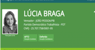 A ex-deputada estadual Lúcia Braga (PDT), candidata a vereadora de João Pessoa, teve seu registro de candidato deferido pelo Tribunal Regional Eleitoral da Paraíba (TRE-PB) e se mantém na disputa por uma vaga na Câmara Municipal de João Pessoa. Um mal-entendido no Cartório Eleitoral da 64ª Zona acabou gerando ...