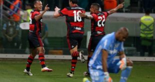 Jogadores do Flamengo comemoram o gol de Alan Patrick, camisa 19, e deixam para trás um goleiro desolado Foto: Pedro Kirilos O Flamengo fez nesta quarta-feira o primeiro gol na partida contra o Palmeiras, que vale a liderança do Campeonato Brasileiro. Em seu primeiro toque na bola, o meia Alan ...